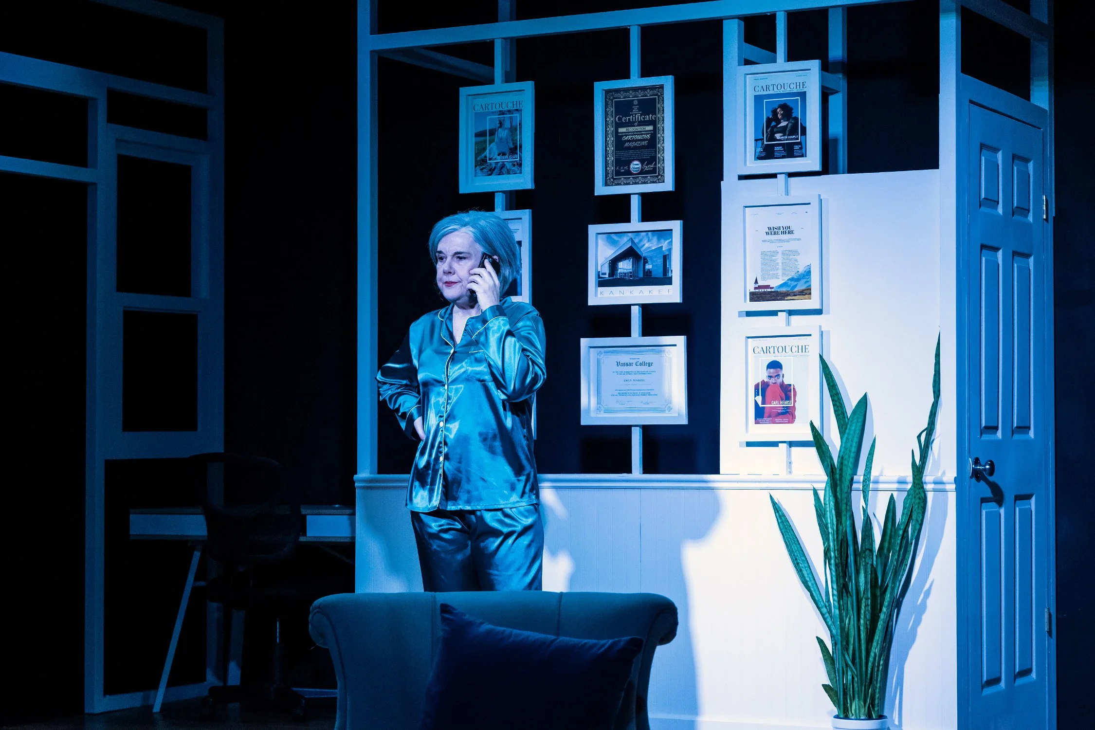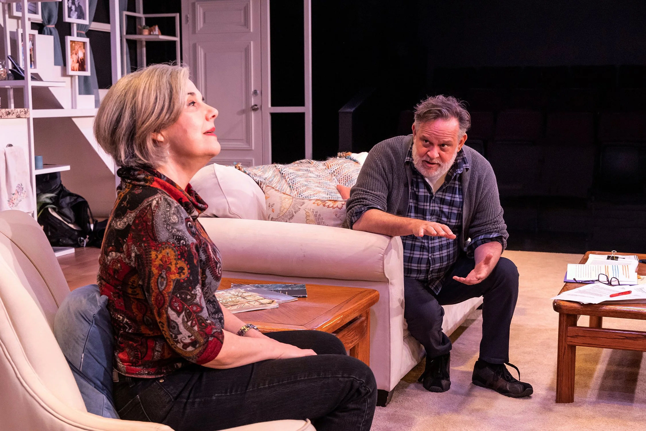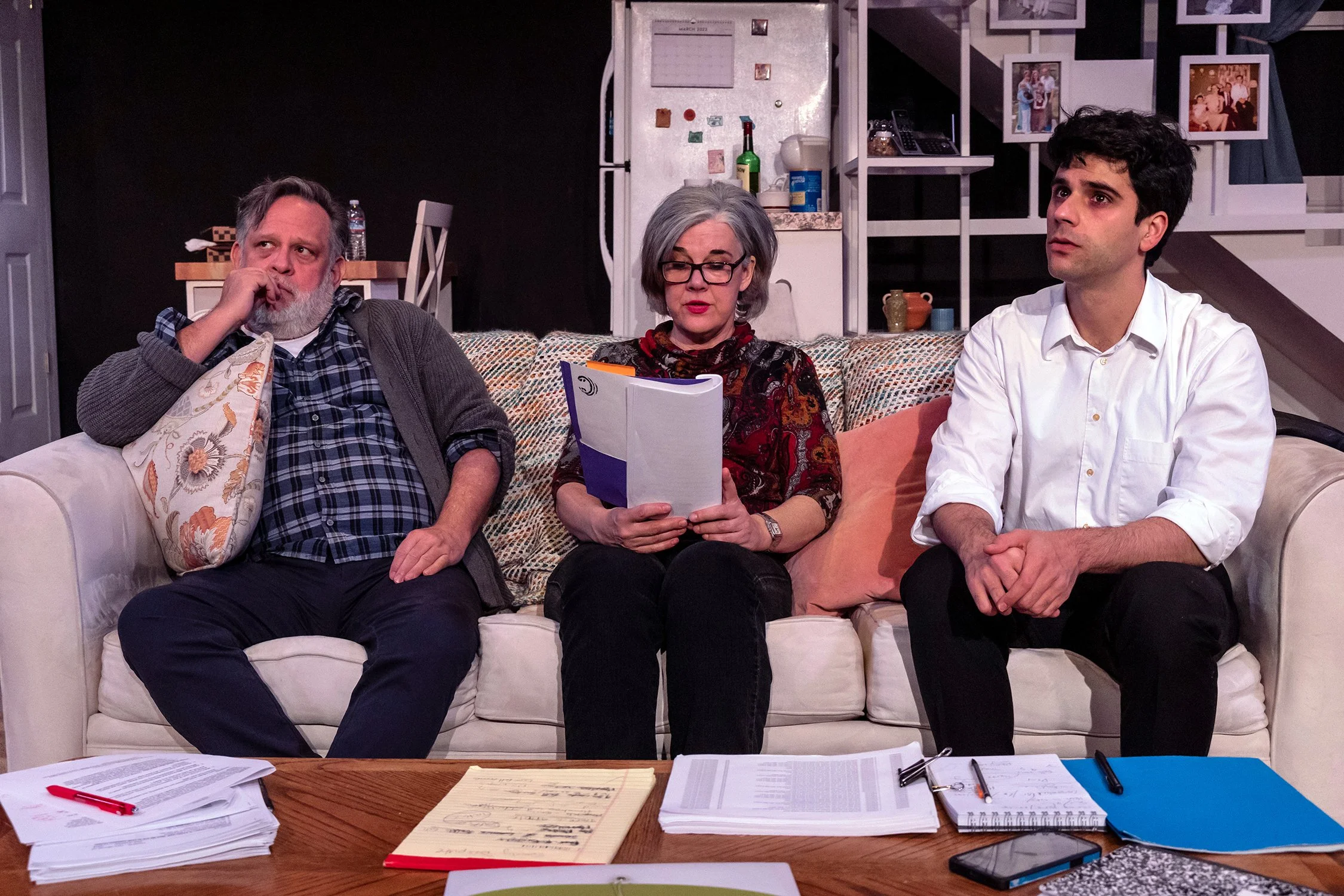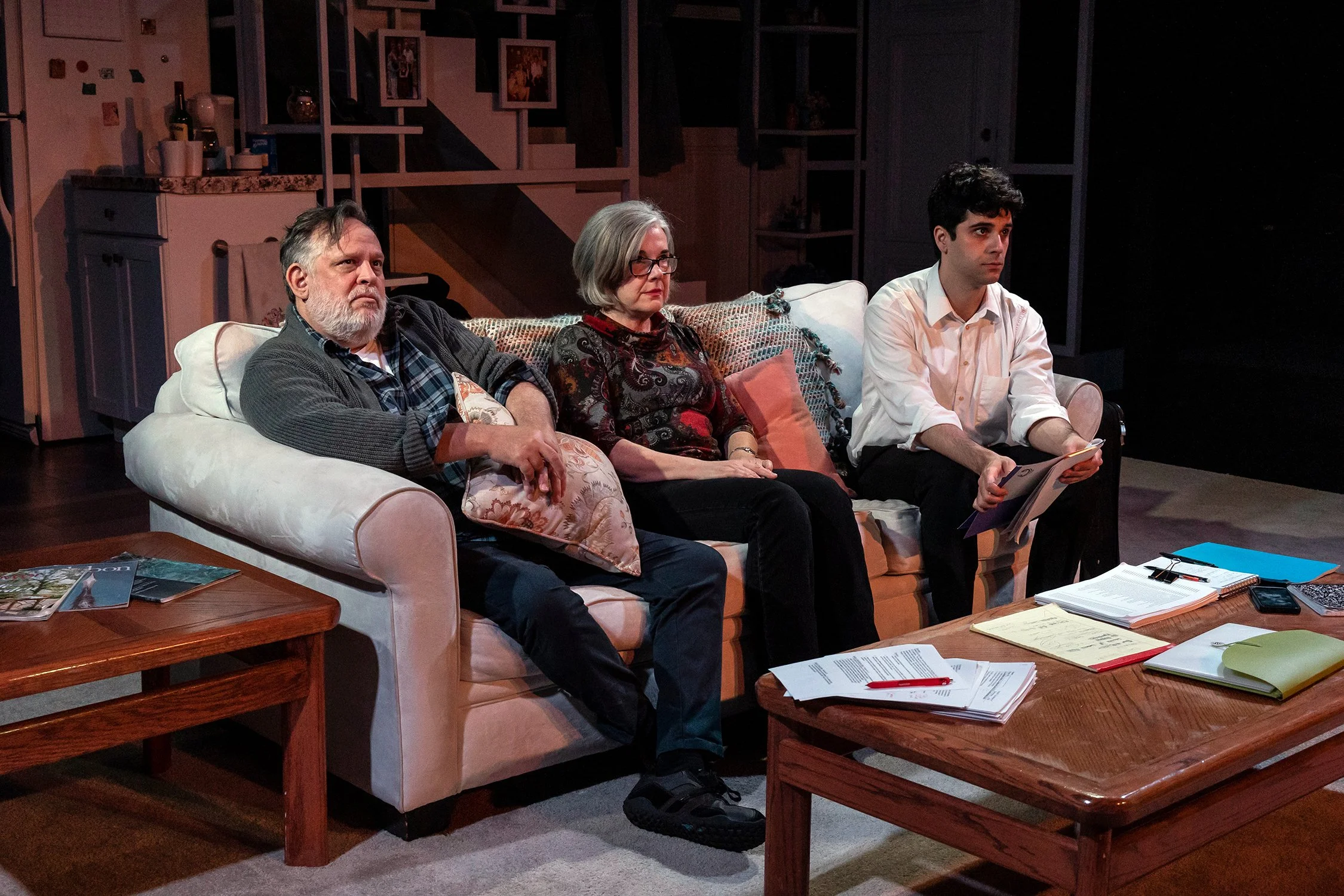 “The Lifespan of a Fact” is based on a true story about a big magazine editor, an essayist and a fact checker. When a sure-to-be award winning essay is sent to a fact checker, the checker flies to the essayist’s house to discuss the error-riddled essay in a comedic yet thought provoking back and forth about the moral implications of facts. The director’s main requests were for a realistic look but to also distinguish for the audience the looks between office and John’s living room. My design achieved this by using natural tones throughout the play and making the living room warmer and office cooler.